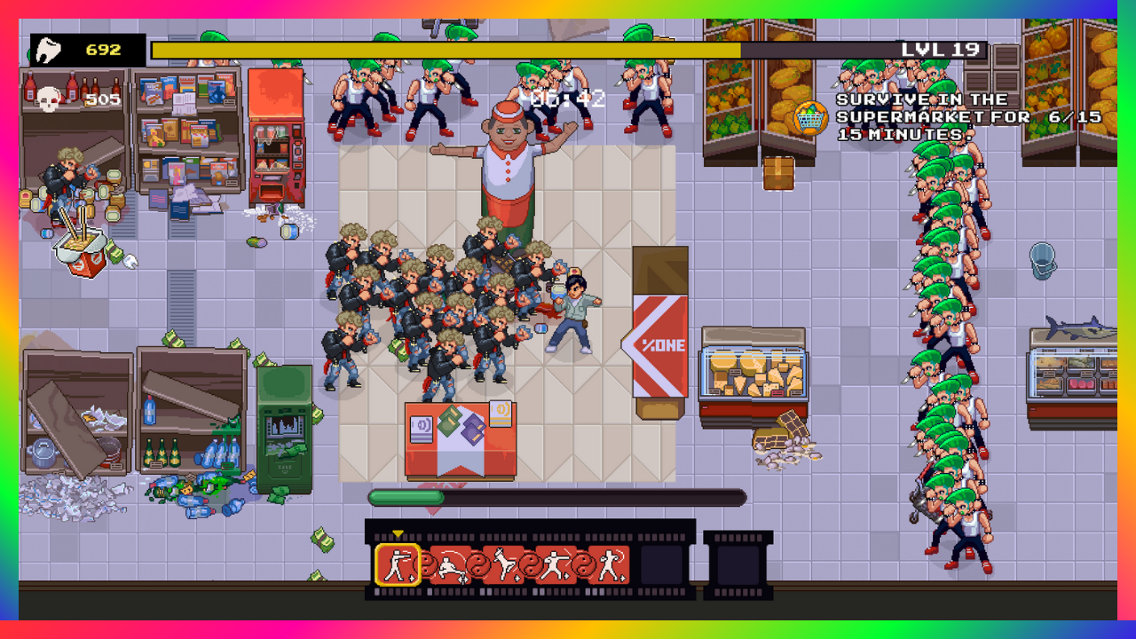 Anybody pushing 30 and played cool math like me during class, you might remember a little game called Johnny Upgrade, in that game you was rewarded on how far you could get into the level without dying. The same concept applies in Karate Survivor, which surprised me. You start out in the game very weak, but you have much in your repertoire just waiting too be unlocked. Smacking enemies with brooms, throwing bottles, kicking your enemies as you slide across tables, vaulting over windows too get a quick breather or escape a pinch. You have a lot waiting for you once you put in the time too upgrade your Karate survivor and it’s worth it. The amount of times i got myself out a pickle by just vaulting through a window, or just spamming back and forth across the tables, is addicting, just brain dead fun.